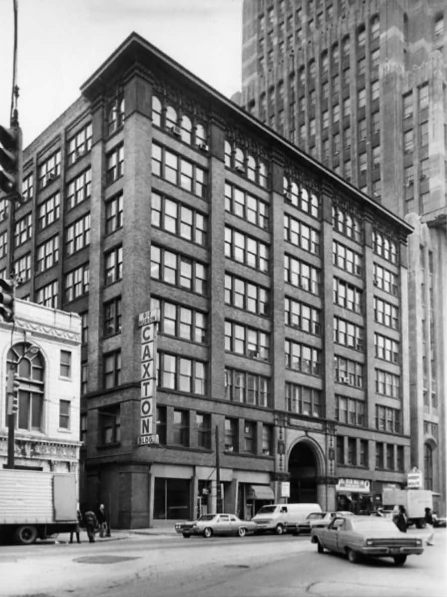 The Ohio Bell (AT&T) Building rises high above the Caxton Building. By the 1970s, this block looked much as it had for fifty years, but the Caxton Building was late in its long run as a mostly printing, publishing, and graphic design center. | Creator: Bill Nehez | Date: November 15, 1973 | Source: Cleveland Memory, Michael Schwartz Library Special Collections at Cleveland State University