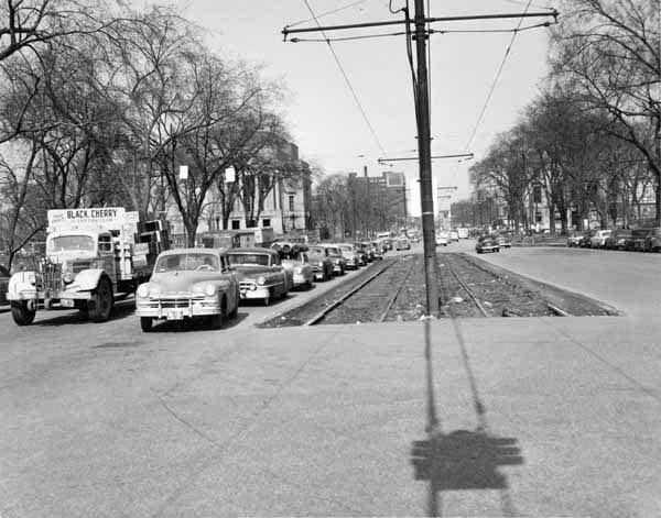 This image shows the remains of the Euclid Avenue streetcar line that once connected University Circle to downtown Cleveland and the city's eastern suburbs. The city would later fill the median space with planters containing trees, flowers and shrubbery.