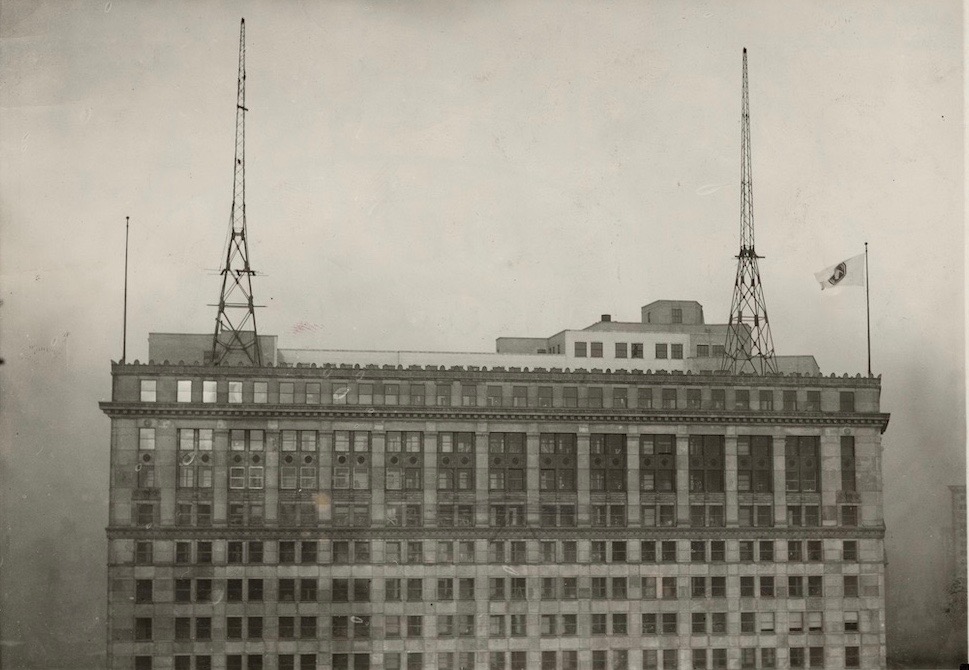 Another feature of the Union Trust building were twin 125 foot radio towers on the East Ninth side of the building's roof. Stretched between the towers was a wire antenna used by radio station WJAX (and later WTAM) which had its offices on the 20th floor of the building. The installation of the towers and wire antenna may have been the origin of a long-standing, persistent legend in Cleveland that the roof of the Union Trust building was designed for dirigible (airship) landings, and had a ticket lobby and waiting room. This photograph, which shows the East Ninth side of the roof where the towers were located, was taken in 1935. | Source: Cleveland Public Library, Photograph Collection.Download Original File