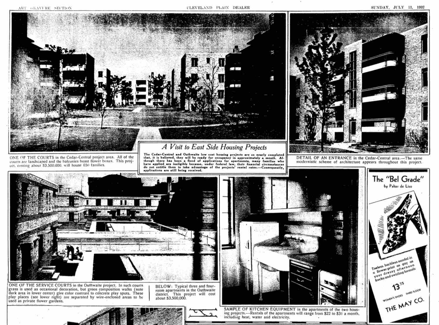 Cleveland’s Plain Dealer had a page expose of the Cedar-Central Apartments upon the complex’s completion in 1937. The newspaper took a look into the architecture, the utilities offered, and future public housing plans for the city. As the first public housing project, there were many questions that the public had about the complex, and it was a point of public interest and discussion. | Date: July 11, 1937 | Source: Cleveland Plain Dealer