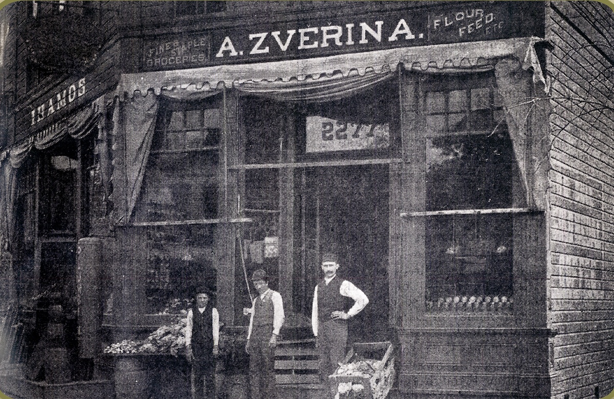 This photograph, taken between 1886 and 1889, shows three individuals (possibly members of the Zverina family) standing in front of the A. Zverina Grocery store at 2277 Willson Avenue. The building shown, which stood at the corner of Willson Avenue (East 55th Street) and Hamlet Avenue, is no longer standing. It was replaced in 1911 by the Olympia Building. | Source: Slavic Village Historical SocietyDownload Original File