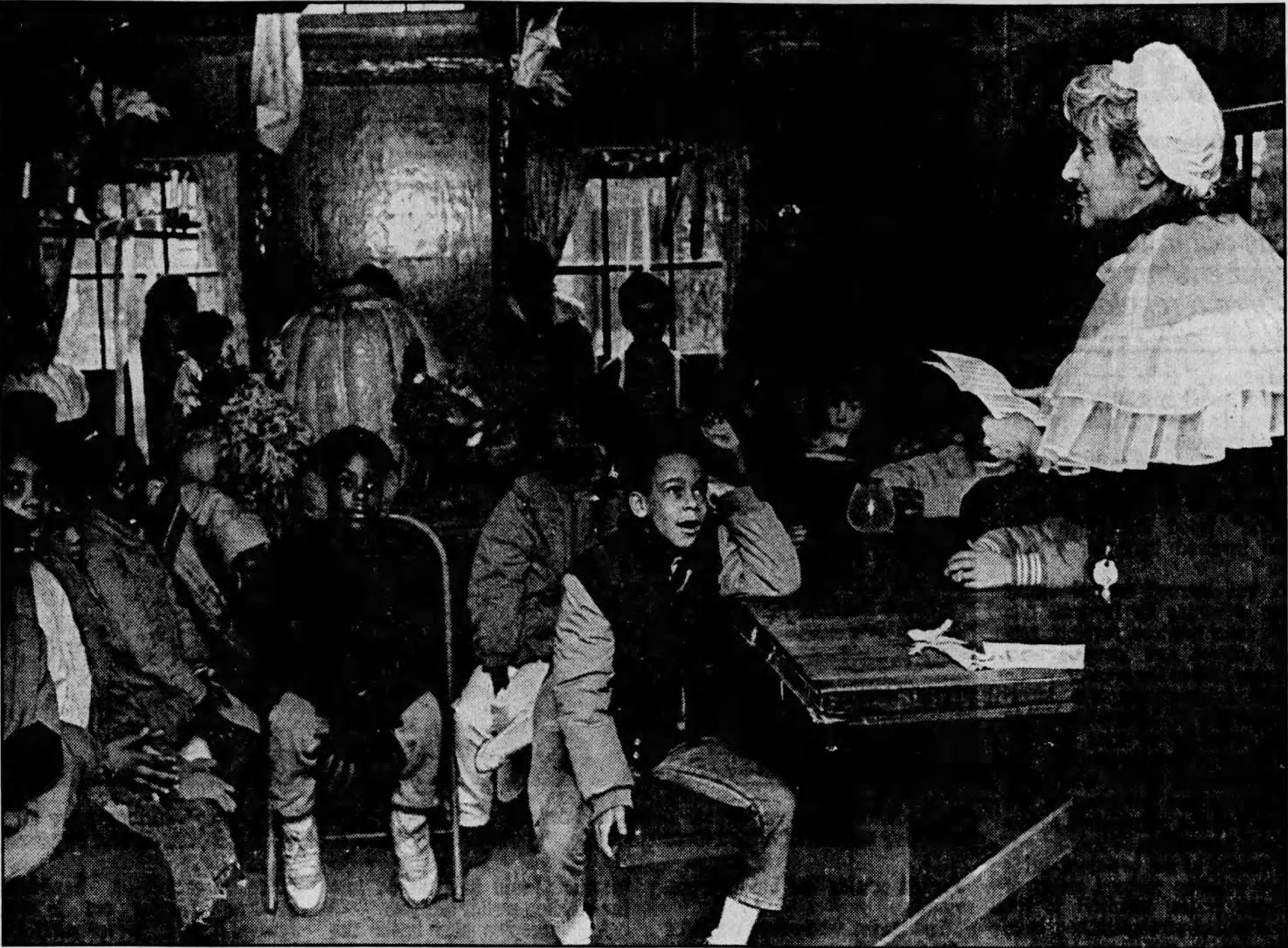 After the Cleveland School Board discontinued the school garden program at the Zverina Log House property in 1978, pastor Ralph Fotia of the nearby Shaffer United Methodist Church volunteered to care for the Log House and gardens on the property. He and his staff did so until at least 1991. Shown in this 1987 photograph is Sandra Votanoff, a secretary at the church, who was using the Log house to teach the seated children from Miles public elementary school a story about the first Thanksgiving celebrated in America. | Date: 1987 | Source: Cleveland Public Library, Digital Newspaper CollectionDownload Original File