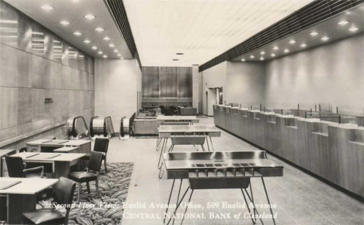 Second Floor Lobby ID: 12704 | This file appears in: Central National Bank Euclid Avenue Office The escalators at left led to the front entrance at street level. | Creator: Central National Bank | Date: ca. 1948 Download Original File CreatorCentral National BankDateca. 1948 "Second Floor Lobby" appears in: Central National Bank Euclid Avenue Office