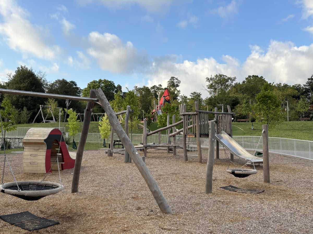 This view from Euclid Heights Boulevard shows that the transformed playground is much more open. Playground equipment is environmentally sustainable and is geared toward offering fun for people of all abilities. | Creator: J. Mark Souther | Date: August 24, 2025Download Original File