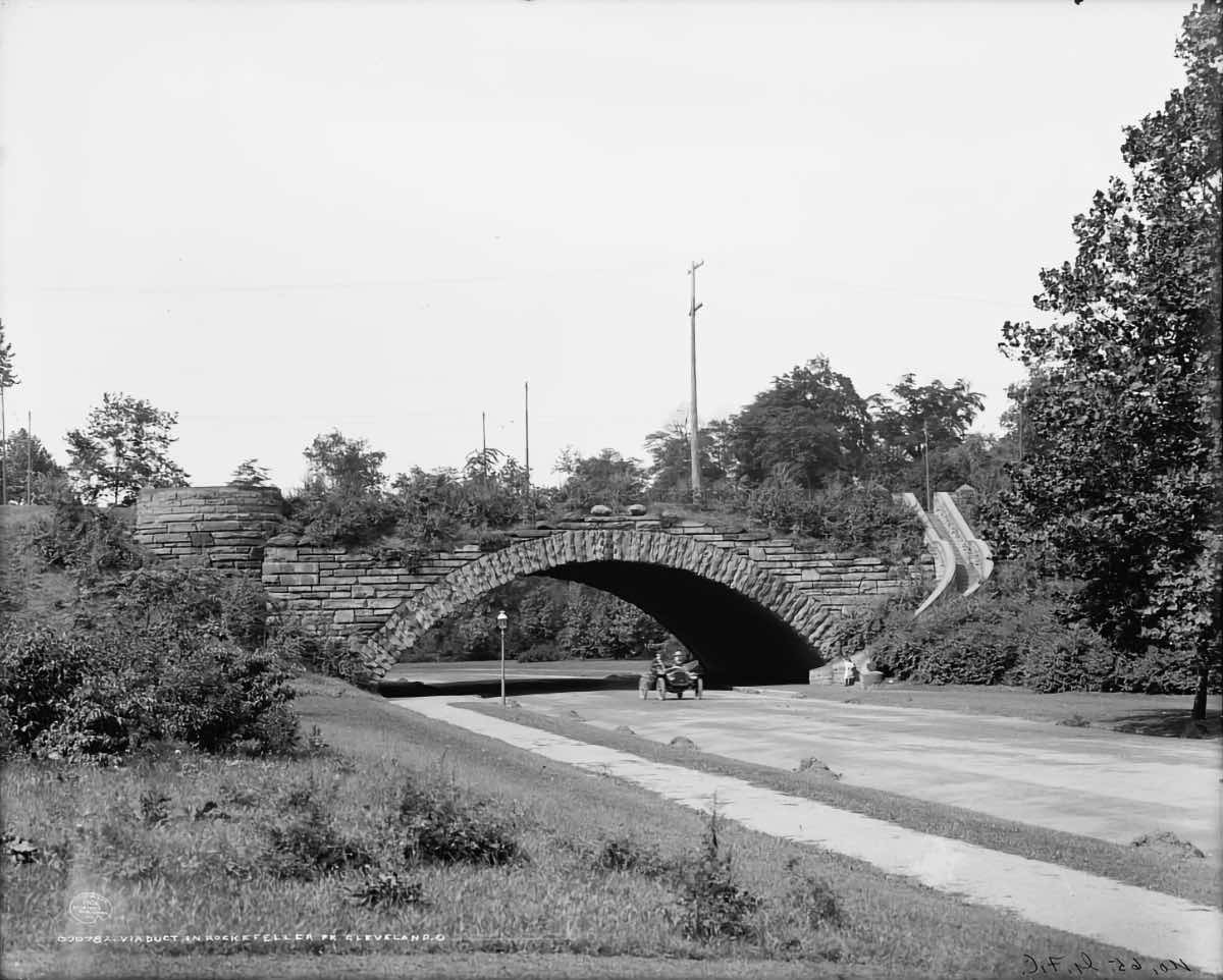 This stone bridge, one of Charles Schweinfurth's four bridges traversing Doan Brook and the parkway (today Martin Luther King Jr. Blvd.) alongside it, carries Wade Park Avenue. Grade separation was a popular principle of landscape architect Frederick Law Olmsted, whose ideas influenced Rockefeller Park designer Ernest Bowditch. A stone staircase enables pedestrians to ascend or descend at this point. | Creator: Detroit Publishing Company | Date: ca. 1908 | Source: Library of Congress Prints and Photographs DivisionDownload Original File