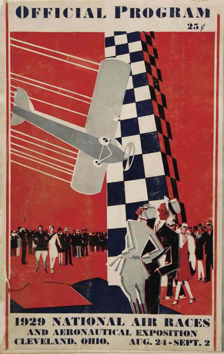 1929 National Air Races Official Program Cover ID: 12727 | This file appears in: Cleveland National Air Races This program cover depicts an airplane flying past a black-and-white checkered pylon as stylized, smartly dressed spectators look skyward. | Creator: National Aeronautic Association | Date: 1929 | Source: Wikimedia Commons Download Original File CreatorNational Aeronautic AssociationSourceWikimedia CommonsDate1929 "1929 National Air Races Official Program Cover" appears in: Cleveland National Air Races