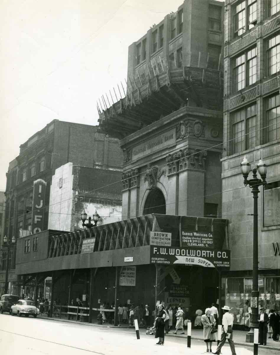 This photo was taken soon before the conclusion of a 70-day demolition of the 17-story Central National Bank headquarters building at 308 Euclid Avenue. Originally opened as the Union National Bank in 1918, the "matchstick" skyscraper barely lasted three decades and yielded to a three-story Woolworth store. The demolition was reportedly the largest ever undertaken in Cleveland up to that time. | Creator: James Thomas | Date: June 8, 1949 | Source: Cleveland Press Collection, Michael Schwartz Library Special Collections at Cleveland State UniversityDownload Original File
