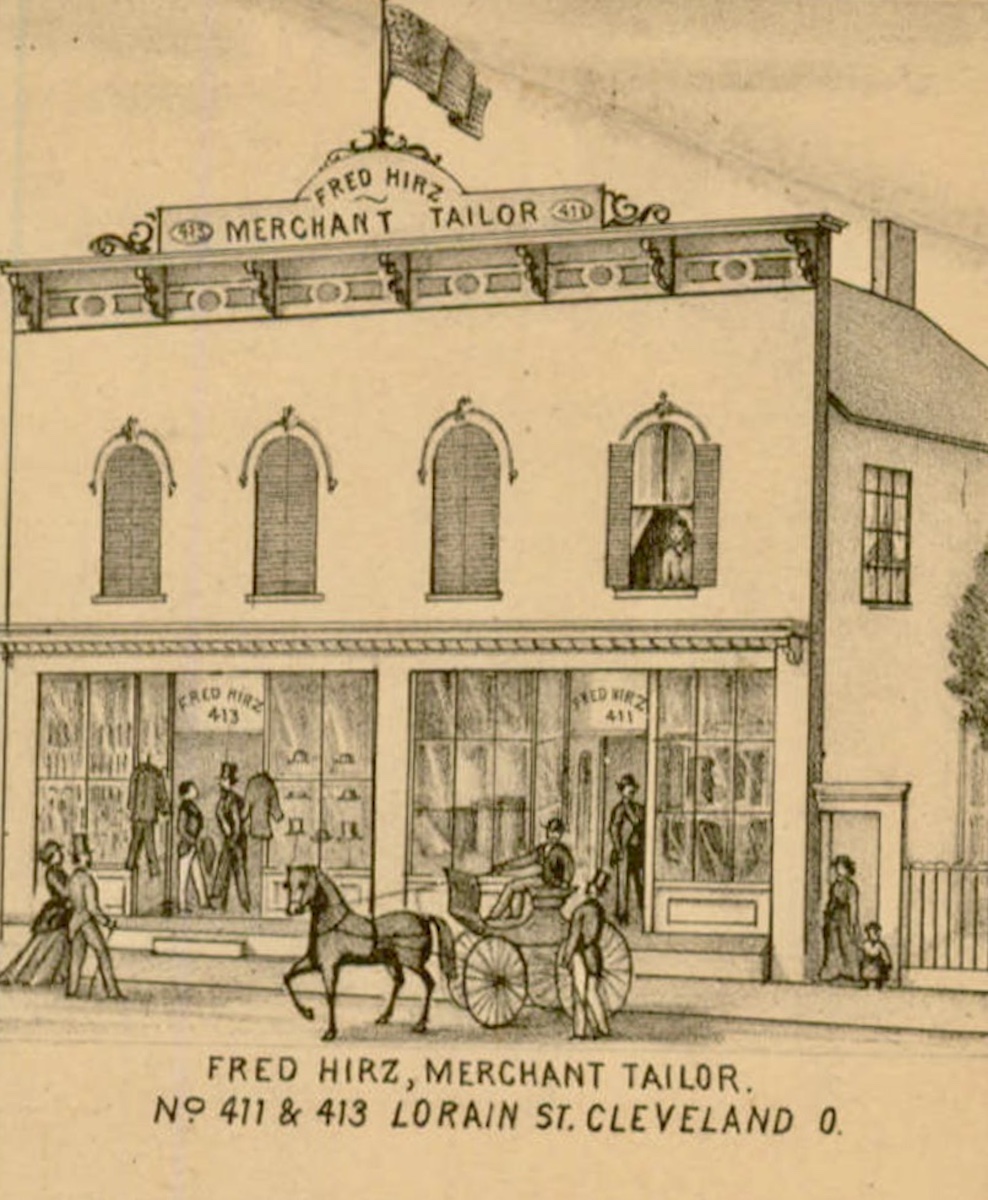 Friedolin Hirz, nicknamed "Fred," was a merchant tailor who, for many years, operated a retail business out of a two-story building on the north side of Lorain Avenue, just west of West 45th Street. When this drawing of that building was made for the 1874 Atlas of Cuyahoga County, he and his family were living in the apartment above his store. Hirz was born in Germany in 1843 and died in Cleveland in 1902. He is among the many German immigrants who are buried at St. Mary Cemetery. | Source: Cleveland Public Library, Map CollectionDownload Original File