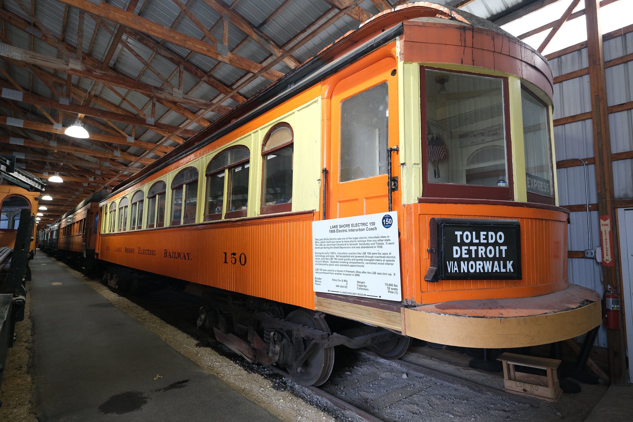 LSE Car 150 was in service from 1906 until LSE folded in 1938. Then it was used as a house in Fremont, Ohio, until 1978, when it was sold for use as a flower shop in Station Square in Pittsburgh. It has been part of the Illinois Railway Museum's collection since 2000. | Creator: Brian Hicks | Date: October 19, 2025 | Source: Flickr (CC BY-NC-SA)Download Original File