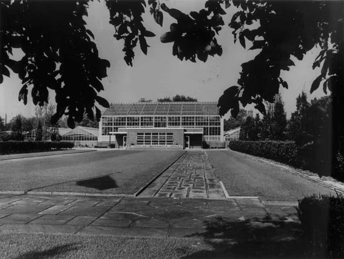 In 1964, the City Greenhouse added a new lobby on the front (north) side of the main greenhouse. The project was among the improvements supported by a grant from the Leonard C. Hanna Fund. | Date: 1964 | Source: Cleveland Press Collection, Michael Schwartz Library Special Collections at Cleveland State UniversityDownload Original File