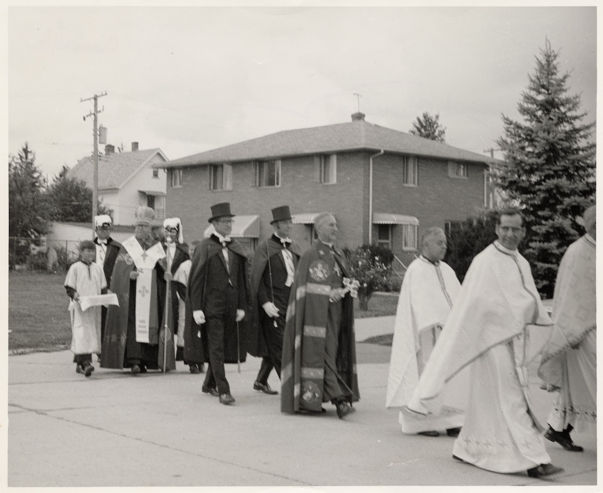 On September 18 and 19, 1971, Ukrainians gathered in Cleveland to celebrate the 100th anniversary of the birth of Ukrainian Poet Lesia Ukrainka. Here, Auxiliary Bishop John Stock (center) leads a procession at Saint Josaphat on State Road in Parma. The event was marred by protests against the procedure by which Stock was appointed a bishop in the Ukrainian Catholic Church | Date: September 18, 1971 | Source: Cleveland Public Library, Photograph CollectionDownload Original File