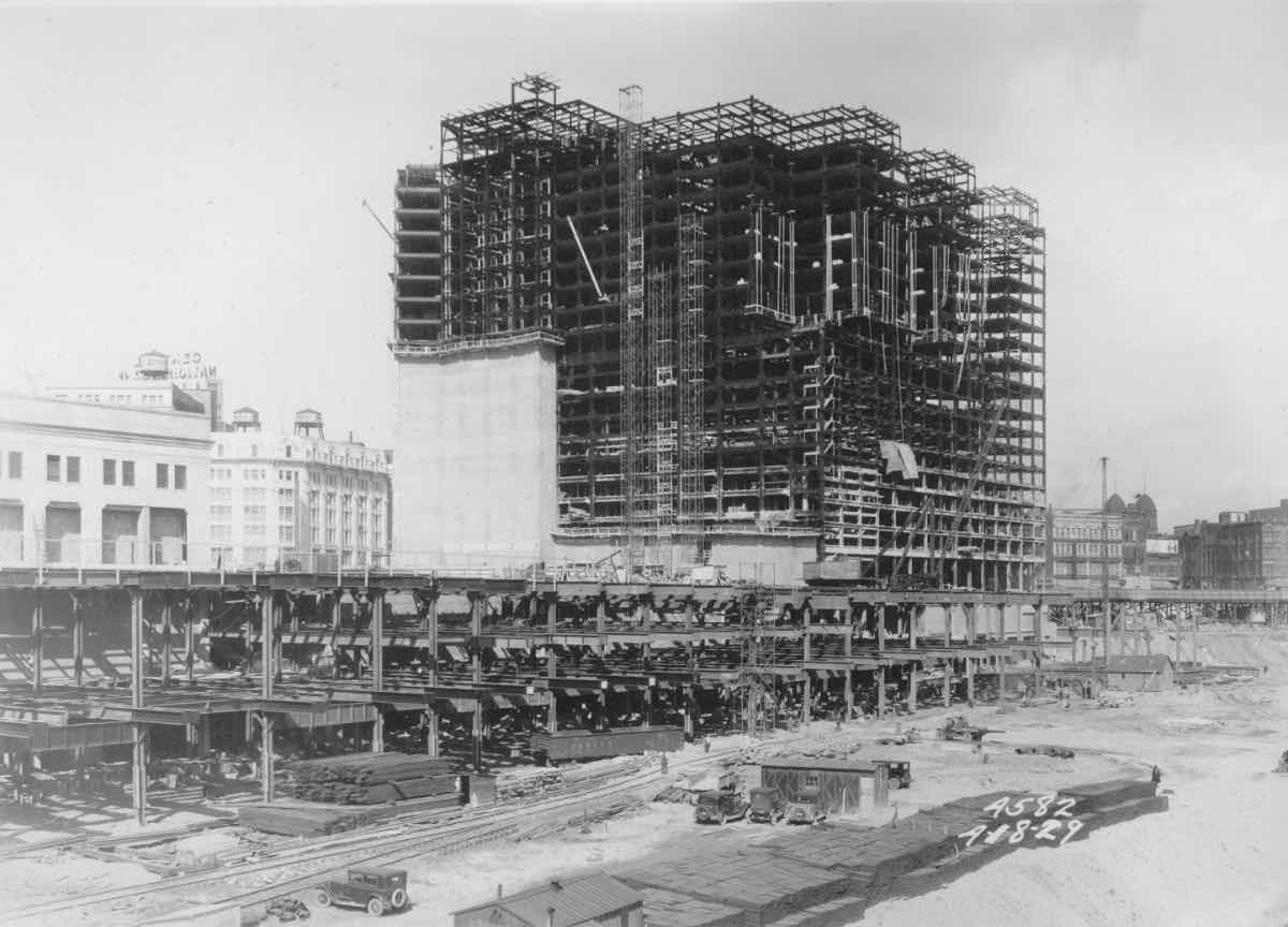 This view of the completed steel superstructure faces east from the river. The Bailey's department store building appears beyond at left. The Higbee's department store building would soon block this view of Bailey's. | Date: April 18, 1929 | Source: Cleveland Memory, Michael Schwartz Library Special Collections at Cleveland State UniversityDownload Original File