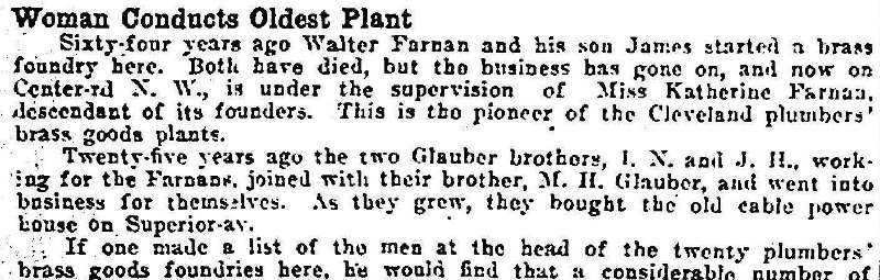 In 1914, the Cleveland Plain Dealer ran an article about the national success of Cleveland's brass manufacturing industry. Katherine Farnan, who took over the operations of Farnan Brass Works after the death of her mother Mary in 1911, was lauded for running the oldest brass manufacturing plant in Cleveland. Farnan Brass was controlled and operated by these two pioneer Cleveland business women from 1875 until 1929, during which time the business prospered. | Source: Cleveland State University Library Special CollectionsDownload Original File