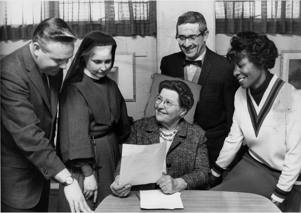 Panel viewing Medicare from various angles moderated by Mrs. Mildred Carson (seated). Speakers are: John Cattin (left) of Downtown Social Security Office, Sister M. Marguerite of St. Vincent Charity Hospital, Dr. Robert Kurzbauer and Mrs. Mabel Hill of Aid for the Aged. | Source: Cleveland State University. Michael Schwartz Library. Special Collections.Download Original File