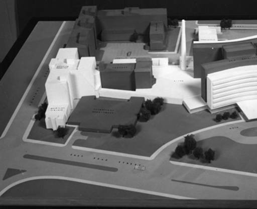 This is an architectural model for the St. Vincent Urban Renewal Area. The expansion of St. Vincent's predates the expansion of the Cleveland Clinic and University Hospitals.