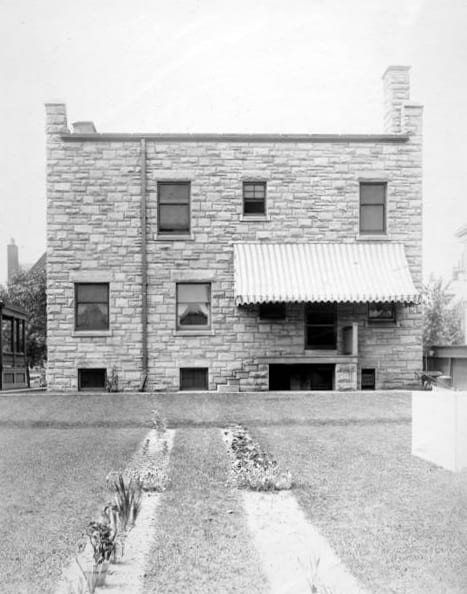The house is of a Romanesque Revival architectural style as indicated by its rock faced stone exterior of random contrasting colors. Further stylistic details of the home include its perfectly rectangular outline and lack of projections, which create an almost "cubistic" effect. This image shows the original back of the house, which today is covered by the 1915 addition. The windows on the first floor left, with an addition of space between them, now create an arch into the larger dining area. | Date: ca. 1894-1914 | Source: Cleveland State University, Michael Schwartz Library, Special CollectionsDownload Original File