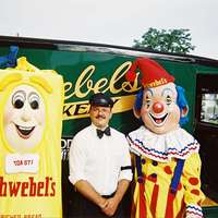 Schwebel's Mascots Happy the Clown and Toasti stand with a Schwebel's driver in front of one of the original delivery…