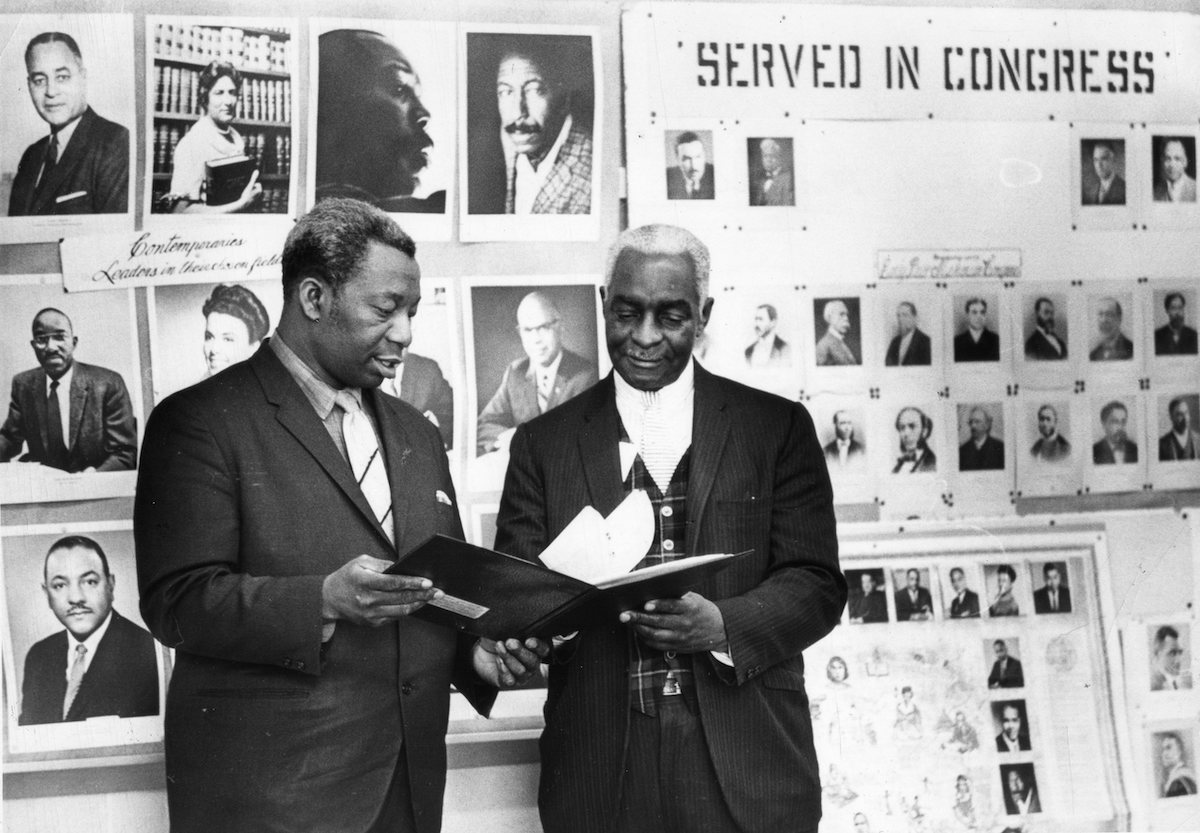 Icabod Flewellen, left, and Garfield Smith, right, at the former site of the Afro-American Cultural and Historical Museum located at 2215 Petrarca Road at the southern end of University Circle. | Date: February 27, 1970 | Source: Cleveland Memory, Cleveland State University Library Special CollectionsDownload Original File