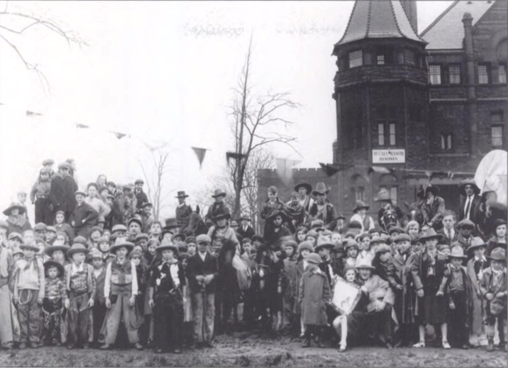 Riders from Parker's Ranch in North Olmsted interact with neighborhood children in front of the Sylvester Everett Mansion at 4111 Euclid Avenue, on May 2, 1932. | Source: Cleveland State University, Michael Schwartz Library, Special CollectionsDownload Original File