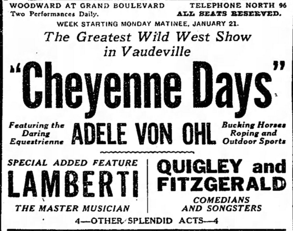 Starring Adele von Ohl ID: 10120 | This file appears in: Adele von Ohl Parker In January 1918, Adele von Ohl Parker traveled to Detroit, Michigan to perform in the "Cheyenne Days" vaudeville act. This ad appeared in the Detroit Free Press on January 20, 1918. | Source: Newspaper.com Download Original File SourceNewspaper.com "Starring Adele von Ohl" appears in: Adele von Ohl Parker