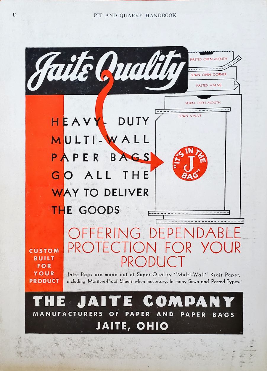 This Jaite Company advertisement appeared in a major national industrial catalog used by miners and manufacturers of crushed stone, sand, gravel, cement, and allied products. At the time of the ad, the company was nearing the end of its tenure as a family-owned enterprise. | Source: Pit and Quarry Handbook (Chicago: Pit and Quarry Publications, 1949), 12. Courtesy of Mark KinslerDownload Original File