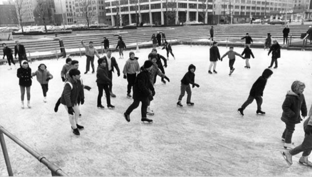 The fountains and reflecting pool of Erieview Plaza doubled as an ice-skating rink in winter. Critics' characterization of Erieview Plaza as a barren, windswept waste in the winter months was a view that became ensconced in the collective memory of the place. But it ignored the wintertime fun of ice skating and summertime concerts and events that enlivened the plaza at least some of the time. | Date: February 22, 1967 | Source: Cleveland Memory Project, Cleveland State University Library Special CollectionsDownload Original File