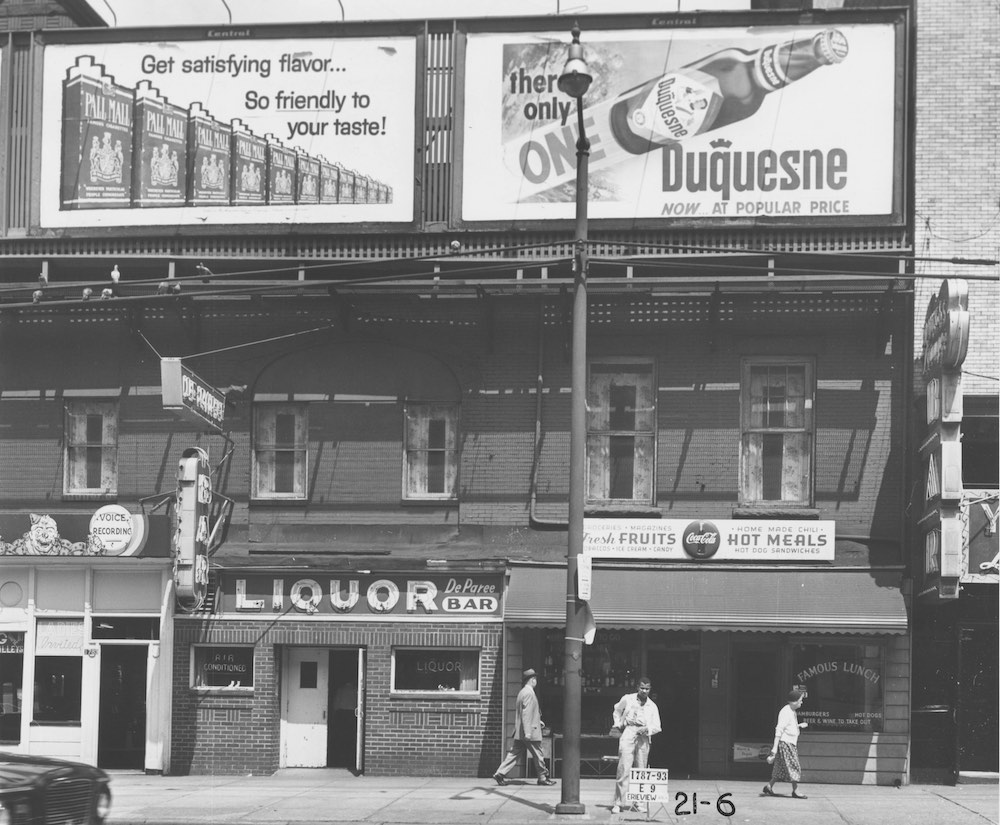 This commercial building on the east side of East 9th Street between Walnut and Chester Avenues housed Jean's Funny House, De-Paree Bar, and Famous Lunch. A man poses behind a sign showing the address and "Erieview." The photo was part of an inventory by the city of structures standing on the footprint of the new urban renewal area. The building survives for several more years until the 17-story Investment Plaza (now Ohio Savings Plaza) replaced it and the adjacent 10-story Intown Hotel, by that time a low-rent single-room-occupancy residential hotel. | Creator: City of Cleveland | Date: 1960 | Source: Cleveland Public Library Photograph CollectionDownload Original File