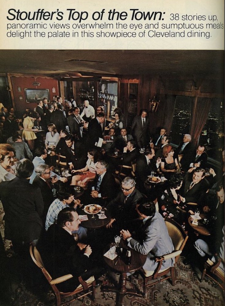 Erieview Tower may have been seen as an eyesore by some, but on its 38th floor it housed one of Cleveland's most prized restaurants, Stouffer's Top of the Town. The Stouffer company had started four decades earlier just down the street with a simple lunch counter. It expanded to a local chain of restaurants by the mid 1930s and then opened a New York restaurant before launching what became a ubiquitous frozen-food business and signature restaurants in several major cities' downtowns. For Clevelanders, the Top of the Town was a special experience – Duck a l'Orange and nightly live WHK radio broadcasts, all with a "glittering panorama of the city, the lake, and far beyond" – from 1964 until its closing in 1995. | Date: May 1975 | Source: Cleveland MagazineDownload Original File