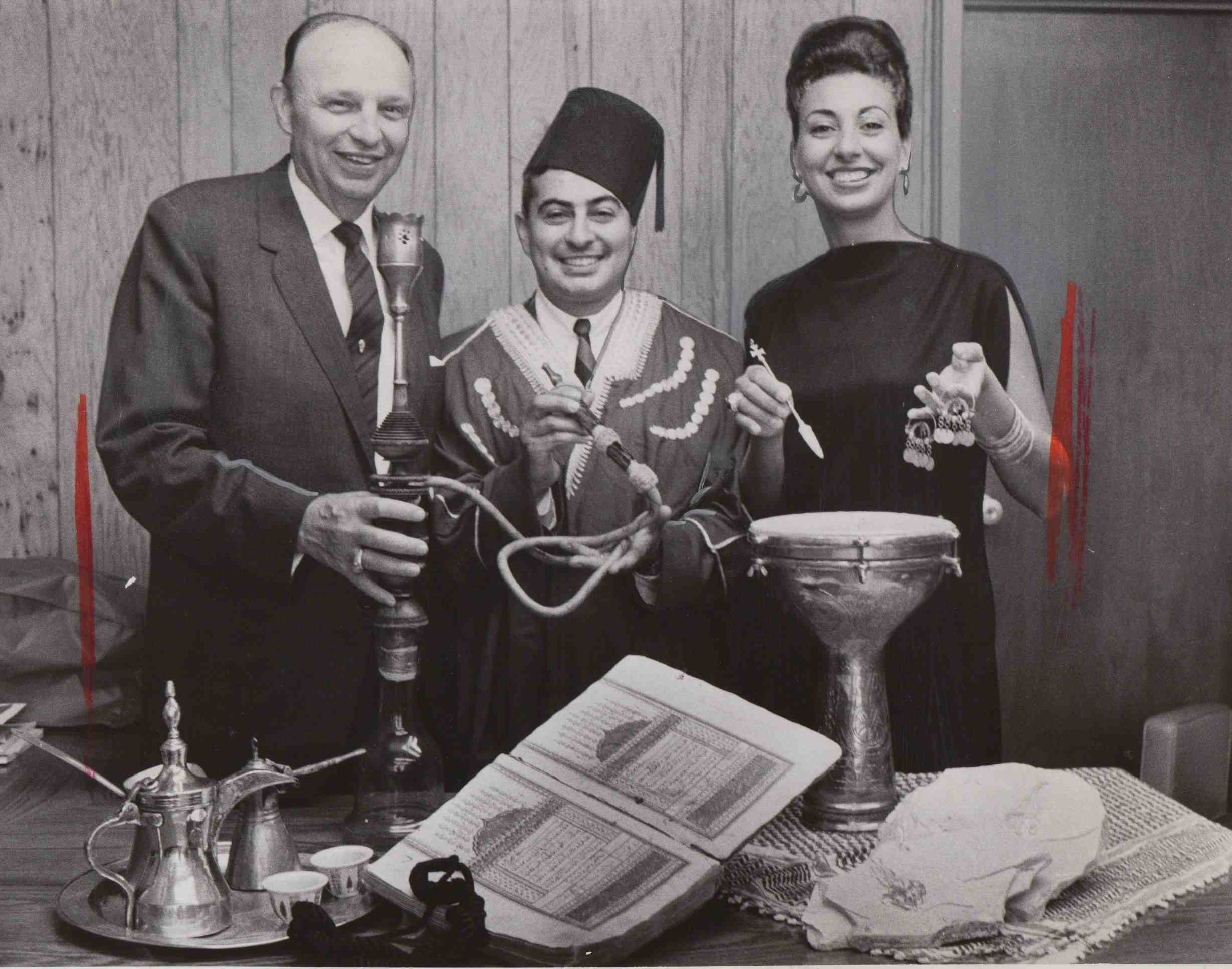 An ancient Koran and other historical items are presented to Edward Esber (center) of St. George Antiochian Church by Mr. and Mrs. Roy Frankhauser for use in the Heritage Room in the educational and cultural center adjoining the church. | Date: 1965 | Source: Cleveland Memory, Cleveland State University Library Special CollectionsDownload Original File