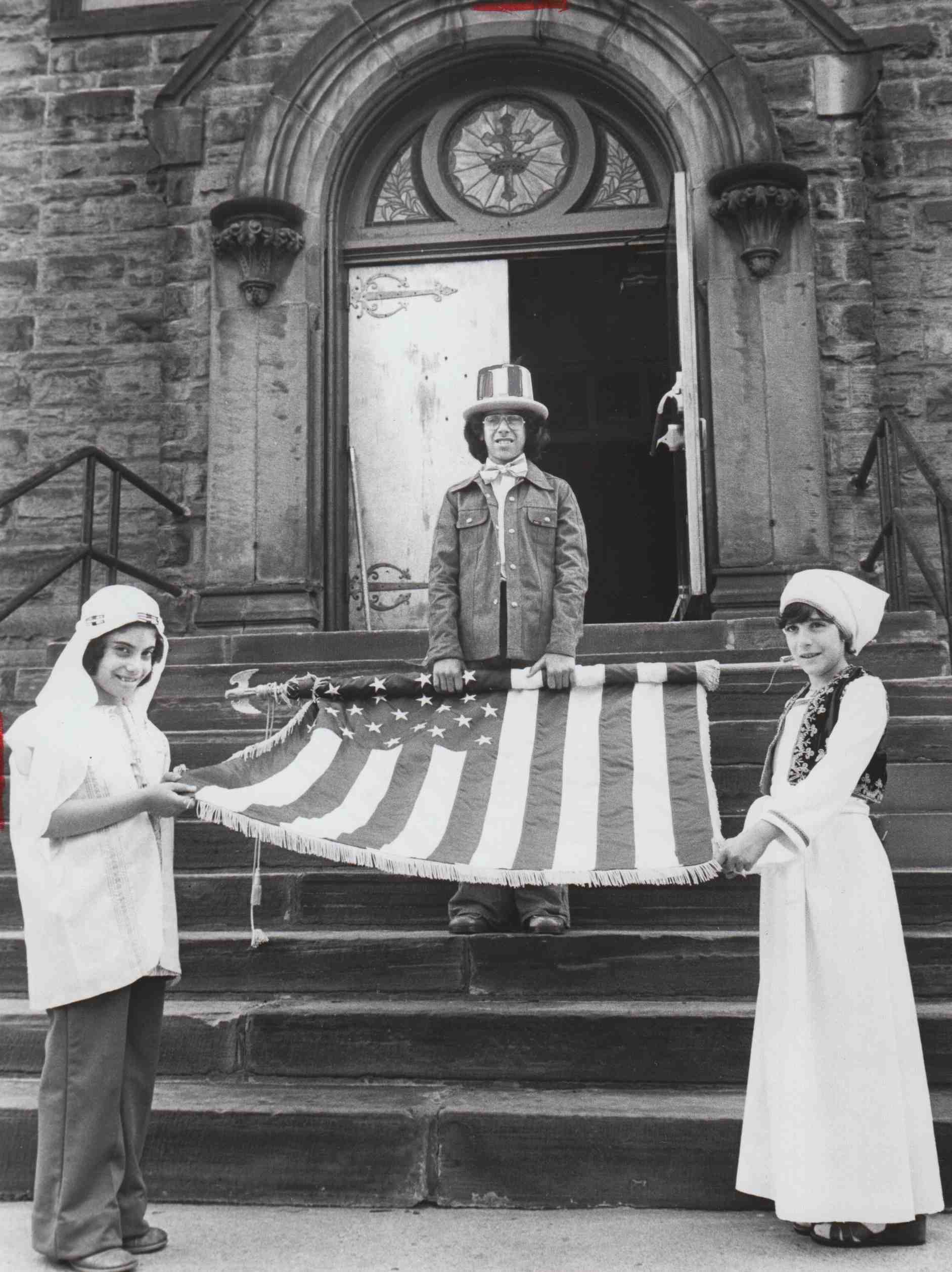 Youngsters — two of whom are dressed in traditional Arab attire — stand on the steps of St. George Antiochian Church with an American flag. | Source: Cleveland State University Library Special CollectionsDownload Original File