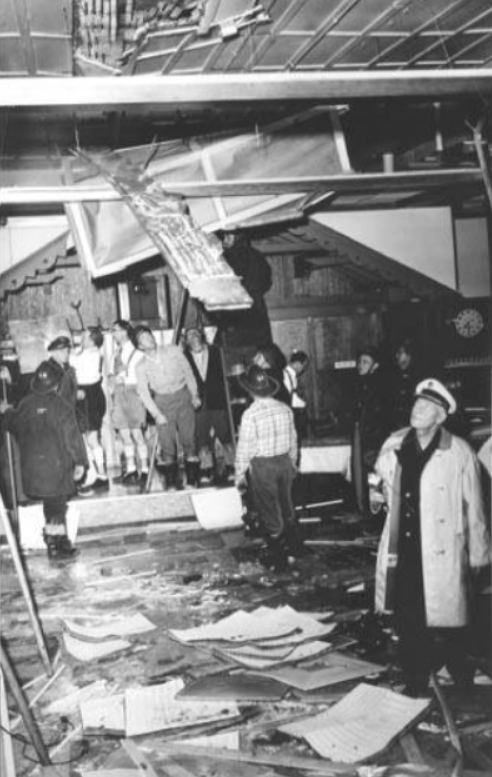 A Cleveland assistant fire chief inspects a collapsed ceiling at Kiefer's Tavern. More than 100 diners were in the restaurant when, on February 16, 1967, pieces of ceiling crashed down on tables, injuring several patrons. | Source: Cleveland State University Library Special CollectionsDownload Original File