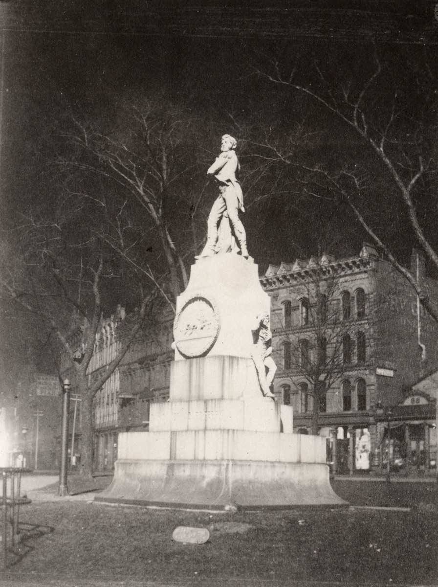 After occupying the center of Cleveland Monument Square for 18 years, Perry was moved to the southeast quadrant, later to be removed for the Soldiers and Sailors Monument. The Cushing Block along lower Euclid Avenue rises behind him in this nighttime scene. | Date: 1878 | Source: Cleveland Public Library Photograph CollectionDownload Original File