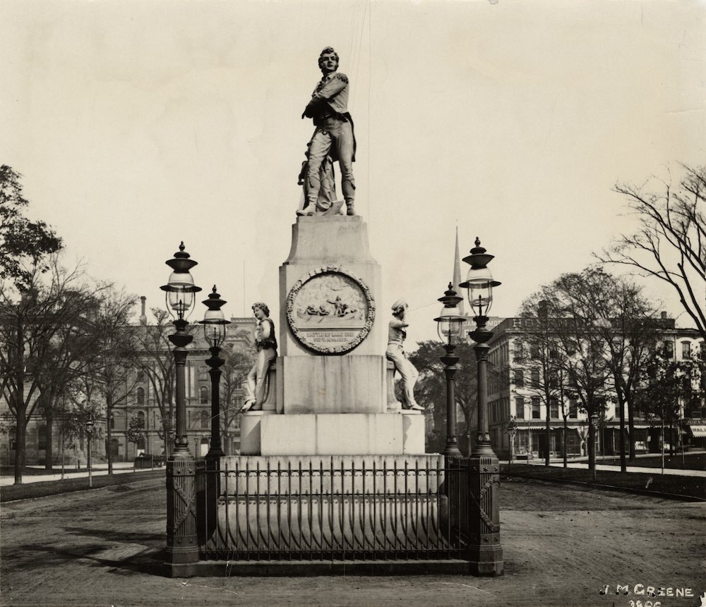 Walcutt's monument to Perry was erected in the center of Public Square in 1860 but moved in 1878 to the southeast quadrant. As it turned out, the move may have saved Perry from standing in the center of a future traffic jam, but the new location placed the monument in the way of the chosen site for the new monument to veterans of the Civil War from Cuyahoga County. The two figures flanking Perry depict and midshipman and a cabin boy. | Date: 1866 | Source: Cleveland Public Library Photograph CollectionDownload Original File