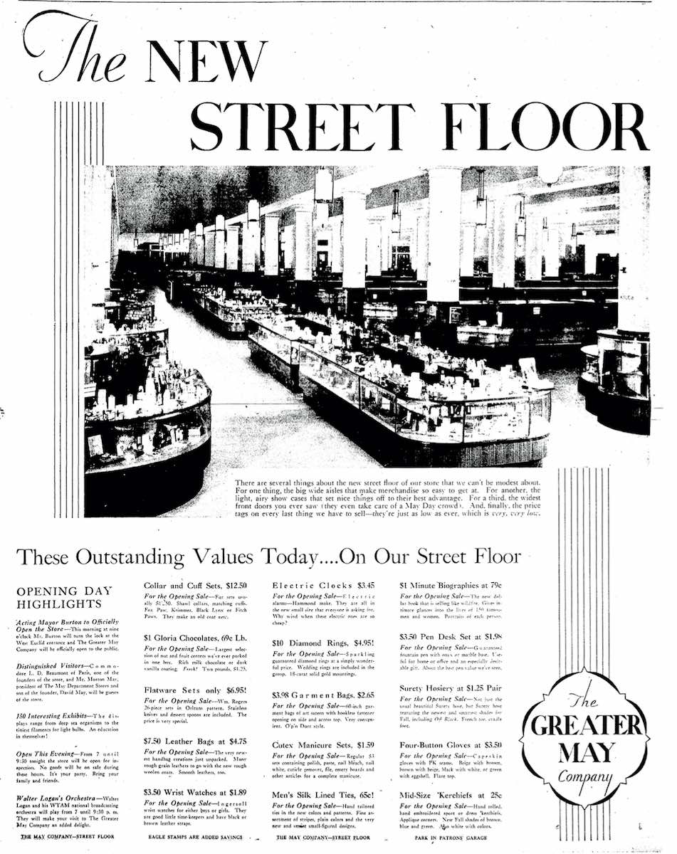 When the May Co. expanded in 1931, it ran a series of advertisements in local newspapers to acquaint shoppers with what they would find on each floor in the reorganized store. The so-called "Street Floor," as its name implied, was at street level and stretched the full length of the block from Euclid Avenue to Prospect Avenue. The expansion in the early part of the Great Depression showed the resolve of retailers to invest for the long term. | Source: Plain Dealer, Nov. 9, 1931Download Original File