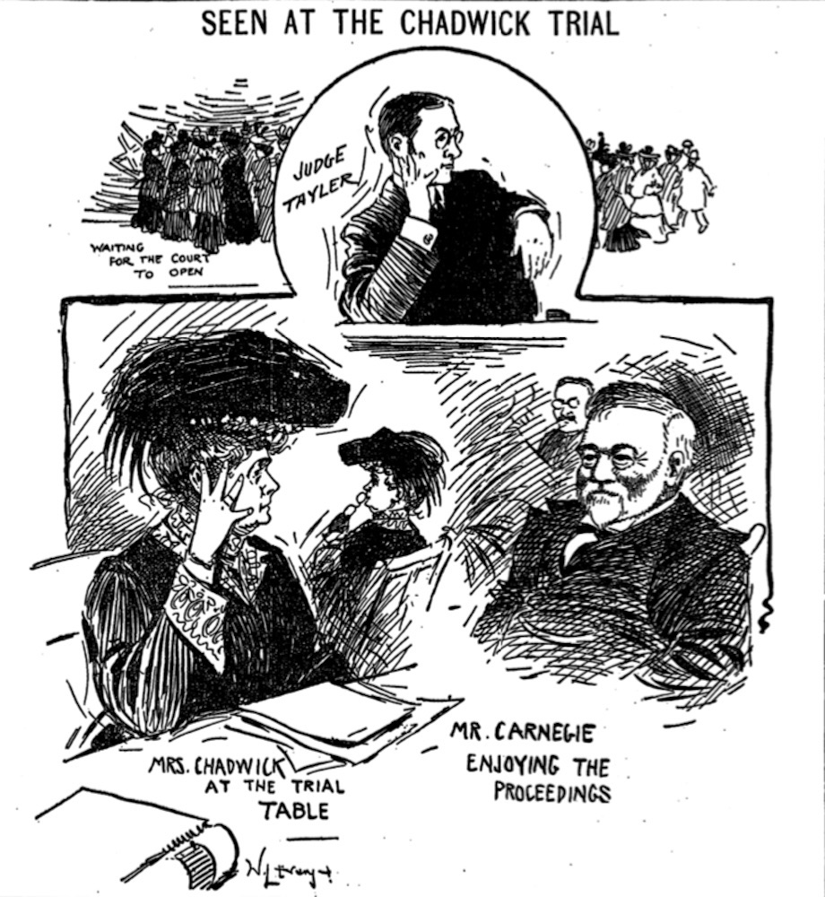 In 1905, the City of Cleveland proposed to rename East Prospect "Sibley Avenue." When residents on East Prospect complained that they did not want that name, the City asked the Cleveland Chamber of Commerce to pick a compromise name. The Chamber settled on "Carnegie Avenue" as a nod to industrialist Andrew Carnegie who had come to Cleveland that year to testify against Cassie Chadwick, a wealthy woman who had swindled several Cleveland banks. The above sketch from the Chadwick trial appeared in the Cleveland Leader on March 7, 1905. | Source: Cleveland Public Library, Newspaper CollectionDownload Original File