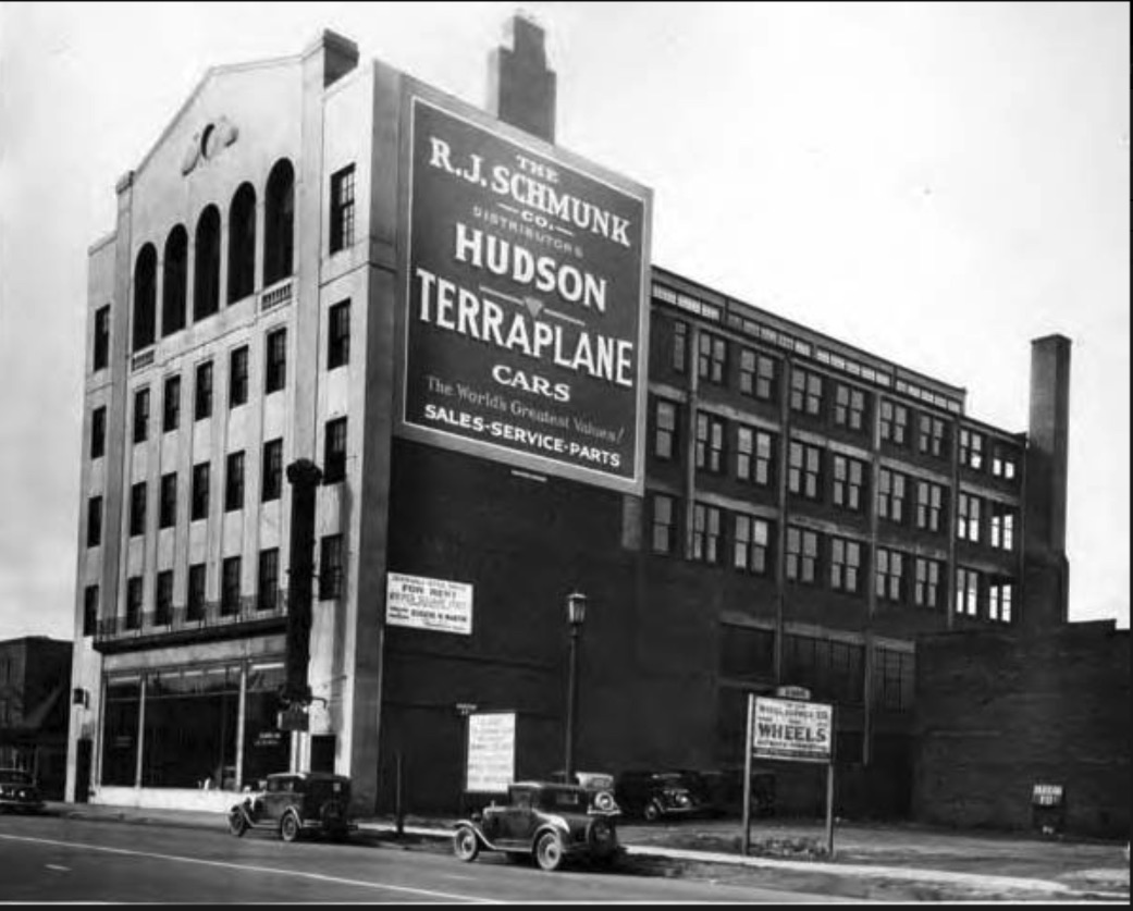 When it was built in 1926 at 2341-2351 Carnegie Avenue, it was originally called the Jones-Finny Lincoln Building after the automobile dealership which occupied the entire first floor of the building. In the 1920s, as realtors and other city boosters touted the benefits of locating on Cleveland's "5th Avenue," a number of automobile dealerships--including ones for Pierce-Arrow, Hudson, and Packard, in addition to Lincoln, responded by moving onto the Avenue in that decade. The building today is better known as the Walker and Weeks building after the famed Cleveland architects who not only designed it but moved their offices to the building. This photograph was taken in 1937 after the Lincoln automobile dealership had left and had been replaced, in 1935, by the R. J. Schmunk Hudson automobile dealership. The building is still standing today and is part of the Walker and Weeks Apartment complex located near the Cleveland State University campus. | Source: Cleveland State University, Michael Schwartz Library, Special CollectionsDownload Original File