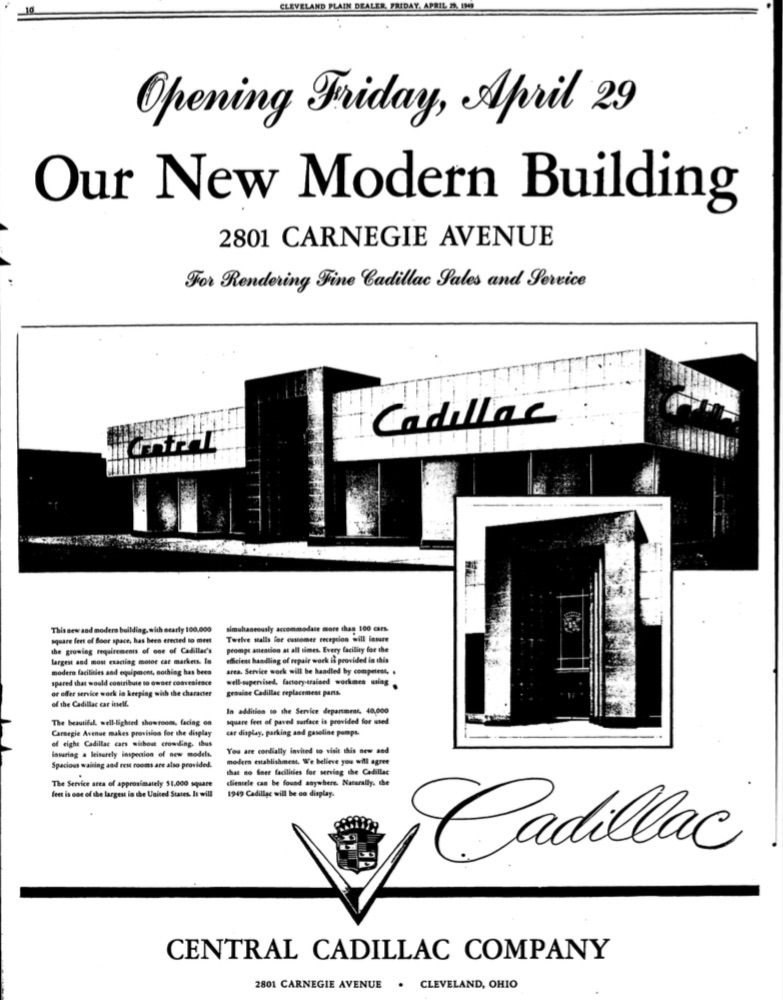 While this automobile dealership was a late arrival among the dealerships which once dotted Carnegie Avenue from East 22nd to East 89th Streets, it is the only new car dealership that has survived on the Avenue to this day. Central Cadillac, which opened for business in 1943 on East 71st street, moved to a new "state of the art" dealership building at 2801 Carnegie Avenue on April 29, 1949. | Source: Cleveland Public Library, Digital Newspaper CollectionDownload Original File