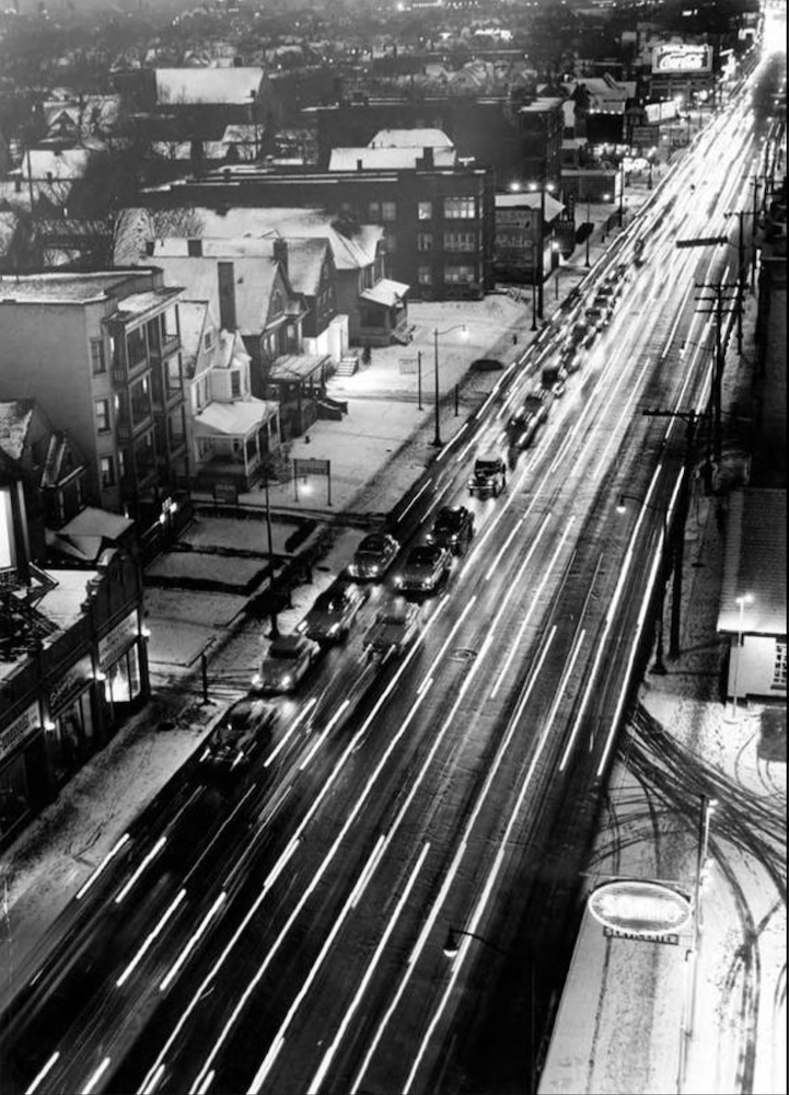 On December 17, 1953, the City of Cleveland began an "experiment" with one-way traffic on Carnegie Avenue during evening rush hour from 4:00-6:30 PM. The "experiment" would last for 50 years, ending in 2003. This photograph, dated December 17, 1953 shows traffic heading east on Carnegie near East 89th Street, presumably after 6:30 PM. Note the five houses and apartment buildings on the south side of the street. All are now gone, largely replaced by a Cleveland Clinic parking lot that stretches from East 89th Street almost all the way to East 86th Street. | Source: Cleveland State University, Michael Schwartz Library, Special CollectionsDownload Original File