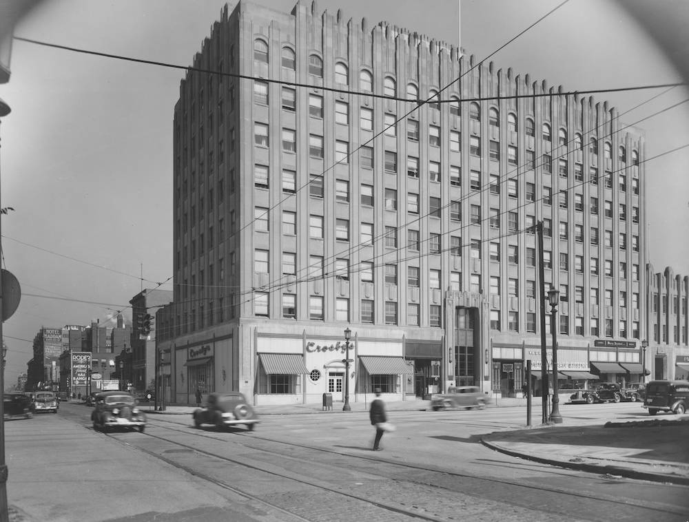 While the 1920s were the heyday of commercial construction on Carnegie Avenue, commercial buildings continued to be erected on Carnegie Avenue for the next three decades. In 1931, this beautiful eight-story art deco medical office building was erected at 10515 Carnegie Avenue. It later became the home of the Ohio College of Podiatric Medicine. In 2009, the building was razed by Cleveland Clinic. This photograph of the building, which also shows the popular Crosby's Restaurant on the ground floor, was taken in 1940. | Source: Cleveland Public Library, Photograph CollectionDownload Original File