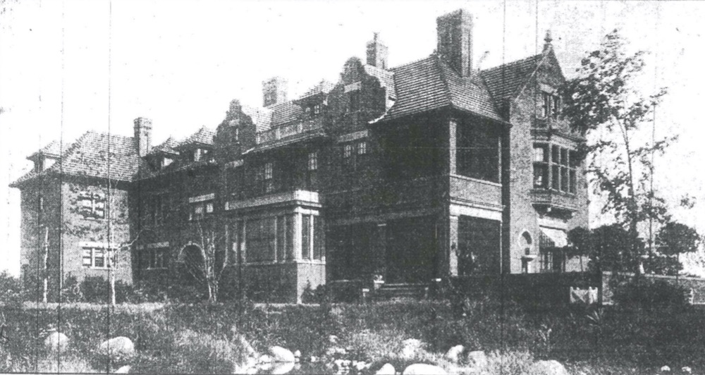 This view of the mansion appeared in an advertisement for "homes of culture and refinement" in the Cleveland Plain Dealer in 1909 showing the north and west facades of the home. | Date: April 9, 1909 | Source: Cleveland Plain DealerDownload Original File