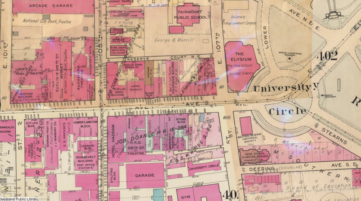 This map shows the location of Fenway Hall in relation to the Elysium and the original streetcar turnaround that gave the University Circle district its name. | Date: 1927 | Source: G. M. Hopkins, Plat Book of Cuyahoga County, Ohio, vol. 5 (Philadelphia: G. M. Hopkins, 1927).Download Original File