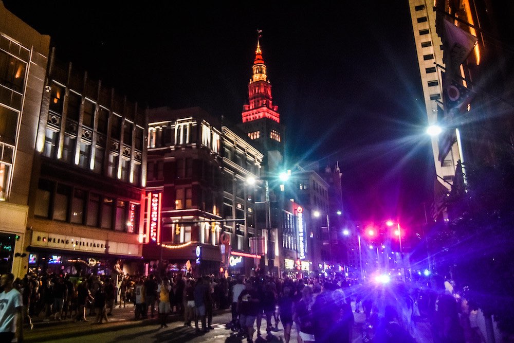 Following the Cleveland Cavaliers' 2016 NBA Championship, the Terminal Tower's LED lights produced the team's signature "wine and gold" color scheme to celebrate the city's end to its long pro sports championship drought. In that same year, Forest City Realty sold Terminal Tower to Cleveland-based K&D, which converted its upper floors into apartments. | Creator: Erik Drost | Date: June 19, 2016 | Source: Flickr, CC BY 2.0Download Original File