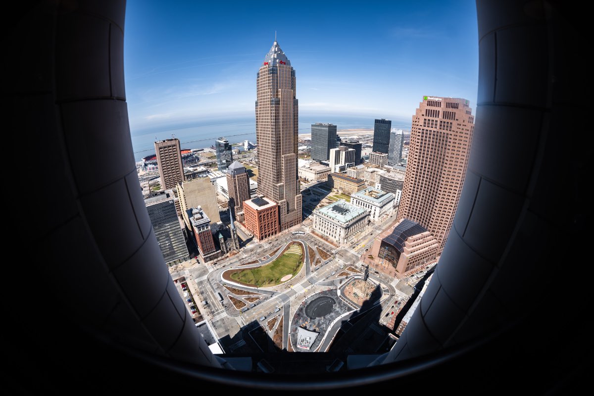 The Terminal Tower Observation Deck on the 42nd floor affords a 360º view of Cleveland. It is reached by taking one elevator from the lobby to the 32nd floor and a second elevator from there to the 42nd floor. The Observation Deck opened in 1930. After a hostage situation that occurred in the Chessie System railroad's offices on the same floor in 1976, the attraction closed for a time. It closed again after the 9/11 terrorist attacks of 2001 and reopened in 2010. The Covid-19 pandemic again forced its temporary closure starting in 2020. | Creator: Erik Drost | Date: April 6, 2019 | Source: Flickr, CC BY 2.0Download Original File