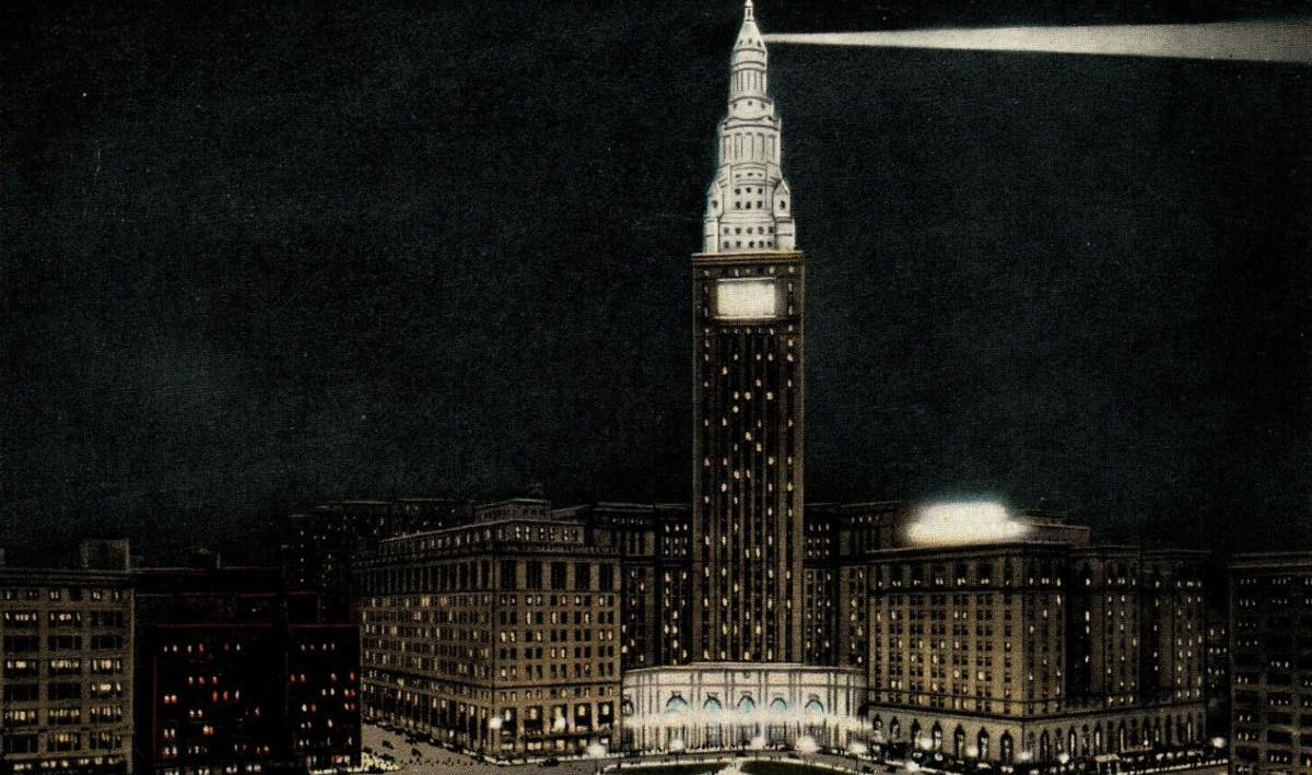 In its early years, Terminal Tower had a powerful strobe that helped guide aircraft and ships. This postcard view also points out the original upper illumination and the lighted scaffold sign that once stood over Hotel Cleveland. | Creator: Tichnor Bros. Inc. / George Klein News Co. | Date: ca. 1930 | Source: J. Mark Souther Postcard CollectionDownload Original File
