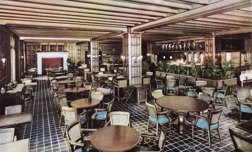 The Gentlemen’s Lounge, or Men's Cafe, in the Hotel Statler displayed its elegance beautifully. From a bar to a beautiful ceiling and library this lounge stood for comfort and luxury. | Date: ca. 1920 | Source: Mark Souther Postcard CollectionDownload Original File
