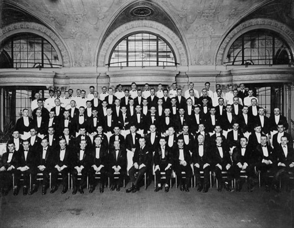Federico Santi, Maitre d' Hotel at Hotel Statler, with his various departments staffs taken in the Grand Ball Room in 1920. | Date: 1920 | Source: Cleveland Memory Project, Cleveland State University Library Special CollectionsDownload Original File