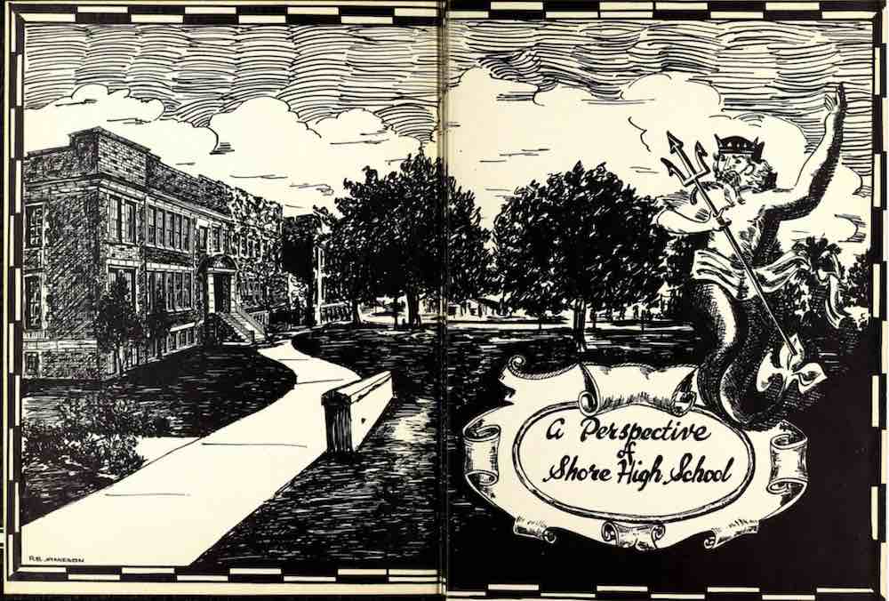 Yearbook Endpaper Illustration ID: 10590 | This file appears in: Shore Cultural Centre This is an image from Shore High School’s 1949 Yearbook. It is a drawing of the school at that time that appeared inside the front cover. | Date: ca. 1948 | Source: Log. Euclid, OH: Euclid Shore High School, 1949. Download Original File SourceLog. Euclid, OH: Euclid Shore High School, 1949.Dateca. 1948 "Yearbook Endpaper Illustration" appears in: Shore Cultural Centre
