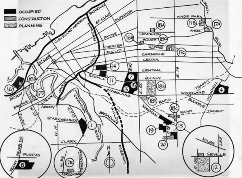 To keep up with demand for an increasingly impoverished area, need for public hosing increased even as support for the social cause decreased in the mid 1960s and beyond. Here, a map of the Cleveland area shows the large housing projects such as Cedar-Central and Outhwaite. The majority of housing projects were on Cleveland’s east side and central/downtown neighborhoods because whites refused to accept public housing in most outer neighborhoods. | Date: February 16, 1961 | Source: Cleveland Memory Project, Cleveland State University Library,Special Collections