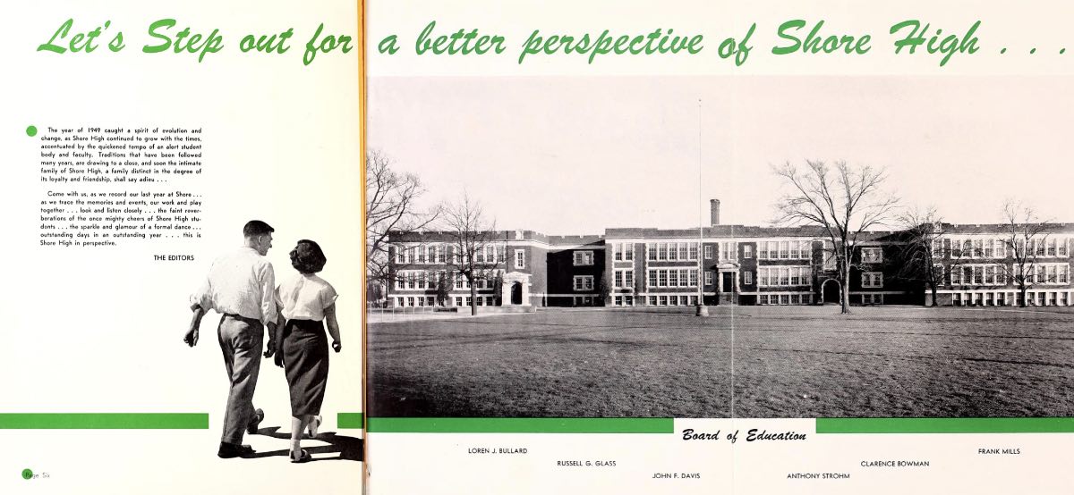 By 1949, as this yearbook photo shows, Shore had grown tremendously to accommodate a student body inflated by Euclid's prosperous postwar suburbanization expansion. This was to be the school's final year serving as a senior high because a new Euclid High School opened that year. It would grow to more than 3,000 students before Euclid began to lose population in the 1970s. | Date: ca. 1948 | Source: Log. Euclid, OH: Euclid Shore High School, 1949.Download Original File