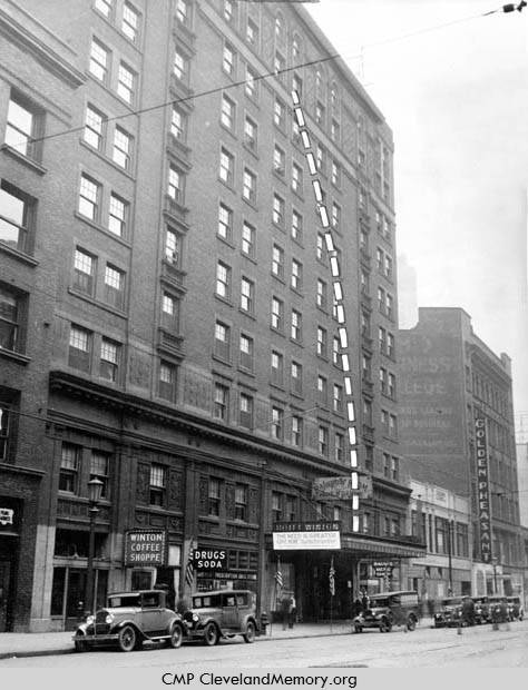 This is a photograph of the Winton Hotel in 1931, right before it was renamed the Carter Hotel. This is of the front entrance of the hotel. The Winton Coffee Shoppe as well as other businesses are photographed in this image. The Golden Pheasant was a Chinese restaurant that opened in 1918.